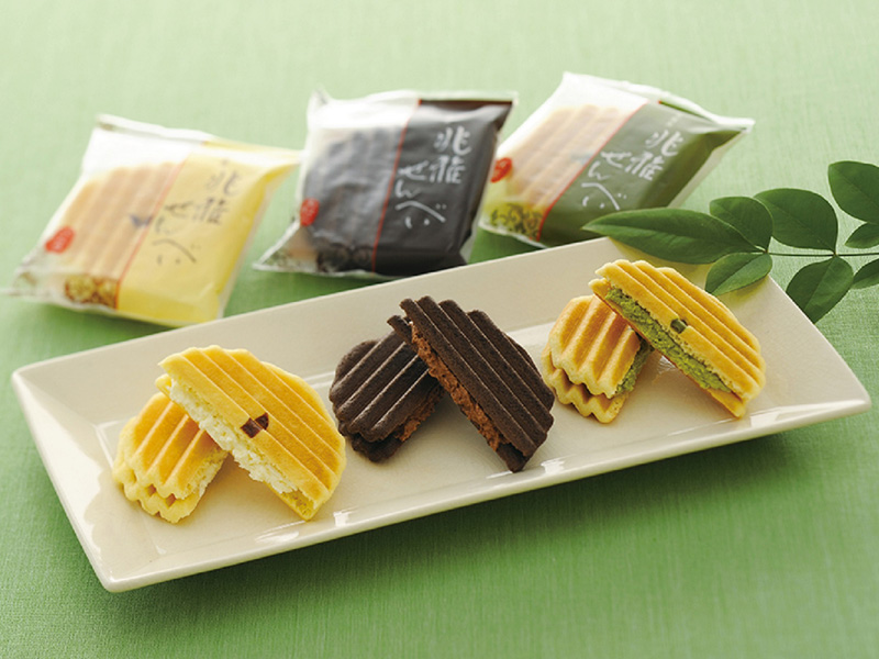 バターを使用し、さっくりと焼き上げた歯ごたえのよいプレーン生地に、やさしく香るバニラクリーム、爽やかに香る宇治抹茶クリームを、ブラックココアを加えて焼き上げたほろ苦いチョコ生地に、ふんわり香るチョコクリームを挟んだ、洋風焼き菓子です。